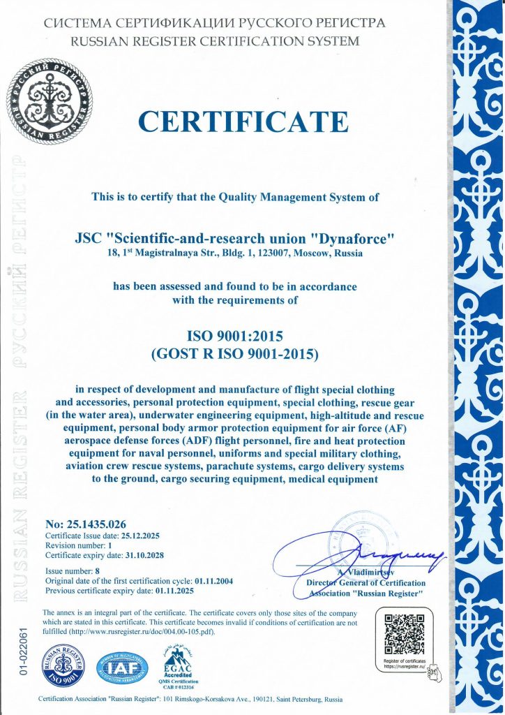 Область применения СМК ЗАО «НПО «Динафорс»: разработка и производство продукции классов ЕКПС: 8475, 8470, 8465, 8415, 4220, 1670 летная специальная одежда и принадлежности, индивидуальное защитное снаряжение, комплекты боевой экипировки, специальная одежда, средства спасения на воде, средств подводных инженерных работ, высотного и спасательного снаряжения, изделий индивидуальной бронезащиты для летного состава ВКС (ВВС), изделий противопожарной и тепловой защиты для личного состава ВМФ, форменной одежды и обмундирования, авиационные системы спасения экипажей, парашютные системы, системы доставки грузов на землю. Оборудование для крепления грузов.