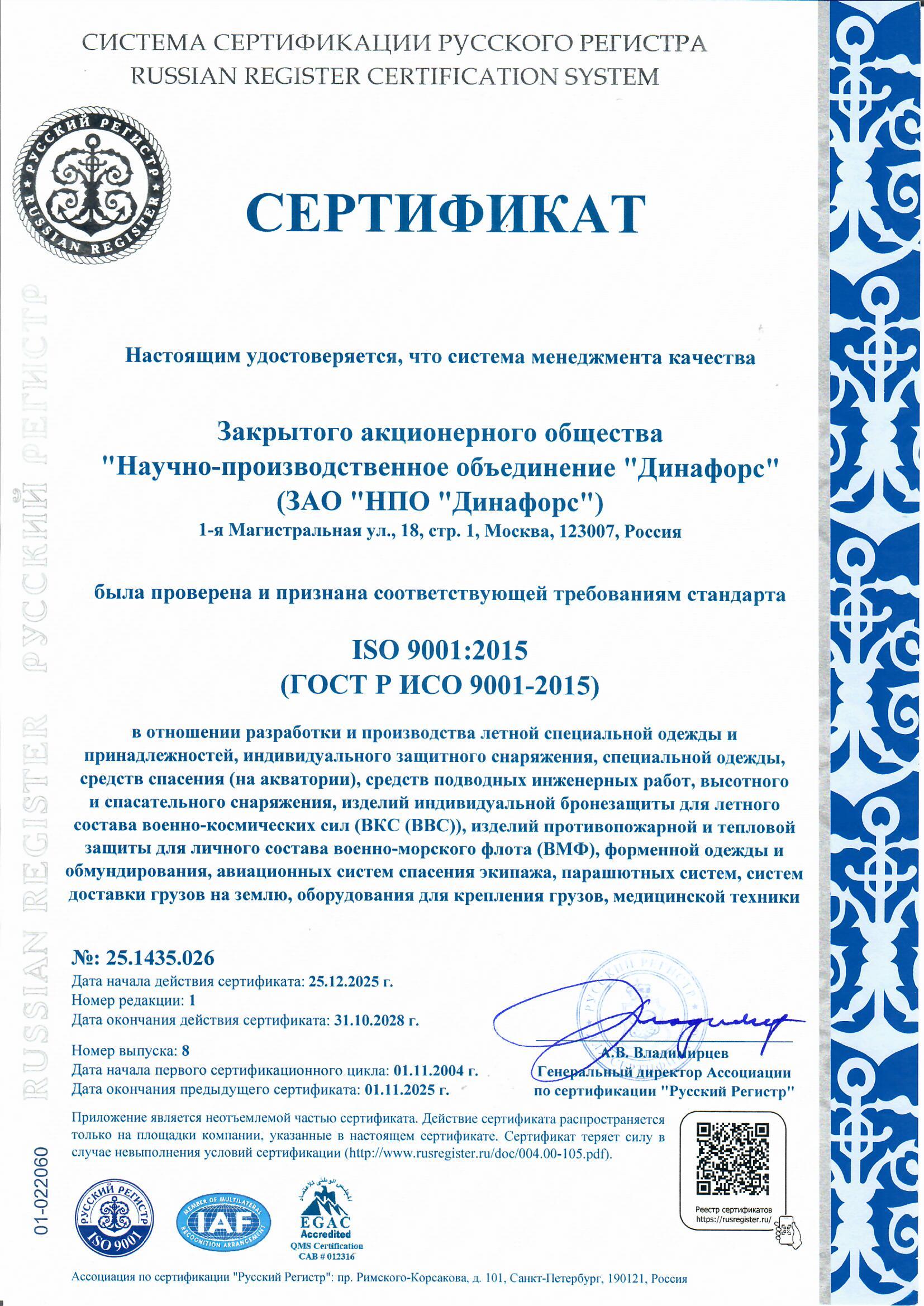 Область применения СМК ЗАО «НПО «Динафорс»: разработка и производство продукции классов ЕКПС: 8475, 8470, 8465, 8415, 4220, 1670 летная специальная одежда и принадлежности, индивидуальное защитное снаряжение, комплекты боевой экипировки, специальная одежда, средства спасения на воде, средств подводных инженерных работ, высотного и спасательного снаряжения, изделий индивидуальной бронезащиты для летного состава ВКС (ВВС), изделий противопожарной и тепловой защиты для личного состава ВМФ, форменной одежды и обмундирования, авиационные системы спасения экипажей, парашютные системы, системы доставки грузов на землю. Оборудование для крепления грузов.